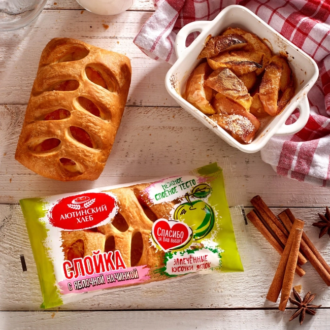Очень нежное тесто, воздушные, много вкусной начинки. Выгодно отличается от аналогичного продукта других производителей за счет большего количества начинки, размера и веса. Начинка в слойке с яблоком приготовлена из запеченных кусочков яблок.