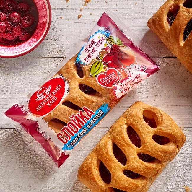 Очень нежное тесто, воздушные, много вкусной начинки. Выгодно отличается от аналогичного продукта других производителей за счет большего количества начинки, размера и веса. Начинка слойки с вишней состоит из натуральных ягод вишни - настоящий вкус лета.