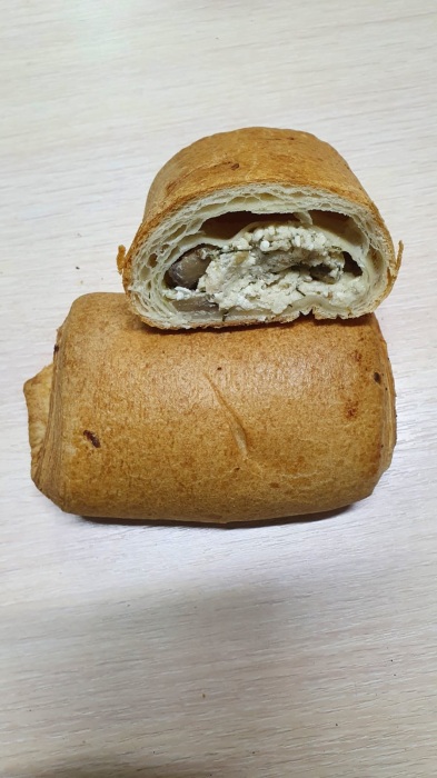 мука пшеничная хлебопекарная высшего сорта ГОСТ, соль, вода питьевая, маргарин для слоения, молко сухое, сахар, начинка (сыр "Брынза домашняя", грибы жареные)