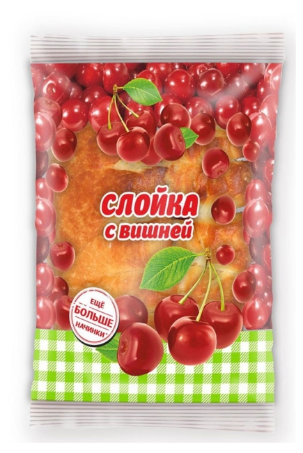 Слоеное изделие оригинальной формы с большим содержаниемсочной вишевой начинки с цельными кусочками. Слойка имеет небольшие надрезы, благодаря которым ощущается приятный аромат.