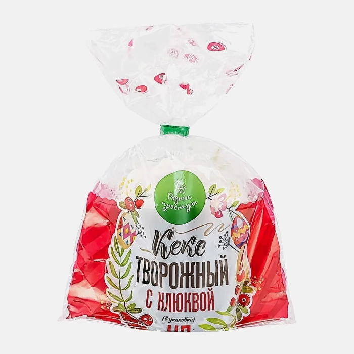 Сахар, мука пшеничная хлебопекарная высшего сорта, творог 9% жирности (молоко цельное, закваска), яйца куриные пищевые, маргарин твердый «столовый с молочным вкусом и ароматом» (рафинированные дезодорированные масла в натуральном и модифицированном виде (пальмовое масло и его фракции, подсолнечное масло, вода, эмульгаторы: Е471, Е475, соль пищевая, ароматизатор «сливки-молоко», краситель (Е160а), регулятор кислотности лимонная кислота), клюква подслащенная сушёная (клюква, тростниковый сахар