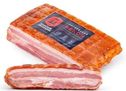 Бекон «Английский» варено-копченый- визитная карточка нашего завода. Продукт незаменимый для праздничной сервировки стола, для приготовления различных блюд, и для банального перекуса. Нежный, сочный бекон, с легким ароматом копчения, и умеренной ноткой муската.