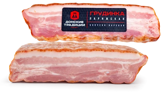 Грудинка «Парижская» вырабатывается из нежнейшей грудо-реберной части свинины по оригинальной рецептуре и особенной фирменной технологии. Гармоничный, нежный мясной вкус, в совокупности с умеренной сочностью и натуральным копчением, превращают нашу грудинку в хит продаж. Масса нетто: 300 гр
