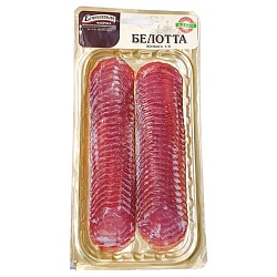 мясо утки, мясо цыплят-бройлеров, шпик, вода питьевая, животный белок, соль пищевая, смесь посолочно-нитритная (соль пищевая, фиксатор окраски-нитрит натрия), чеснок, сахар, молочный белок, комплексная пищевая добавка (стабилизаторы (Е450(i),(iii), регулятор кислотности (Е451(i)), антиокислители (аскорбиновая кислота, аскорбат натрия, Е316, Е575)), пряности (перец черный, тмин, перец душистый), экстракты пряностей (перец черный, мускатный орех, кардамон, чили, чеснок, перец белый), ароматизатор