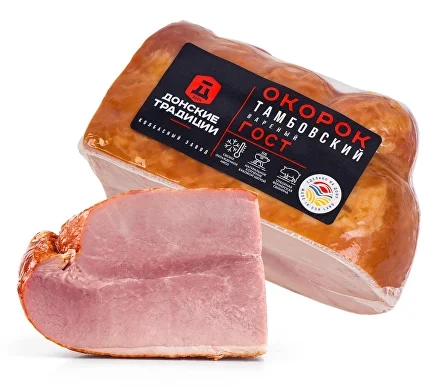Окорок «Тамбовский» -деликатесный продукт наивысшего качества. Нестандартный красивый срез, в меру плотная «кусаемость», доминирующий вкус мяса, подчеркнутый пряностями, делают наш продукт неповторимым и любимым у наших постоянных покупателей.