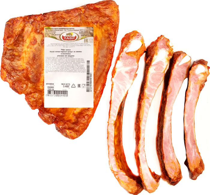 ребра свиные, соль, комплексная пищевая добавка (стабилизаторы – пирофосфаты, полифосфаты; регулятор кислотности - трифосфаты; загуститель – каррагинан; соевый белок; сахар; антиокислитель – аскорбат натрия; фиксатор окраски - нитрит натрия; экстракт пряности - кориандр; усилитель вкуса и аромата - глутамат натрия 1-замещенный; ароматизаторы), пряности: перец черный молотый, чеснок, пищевой краситель - кармины.
