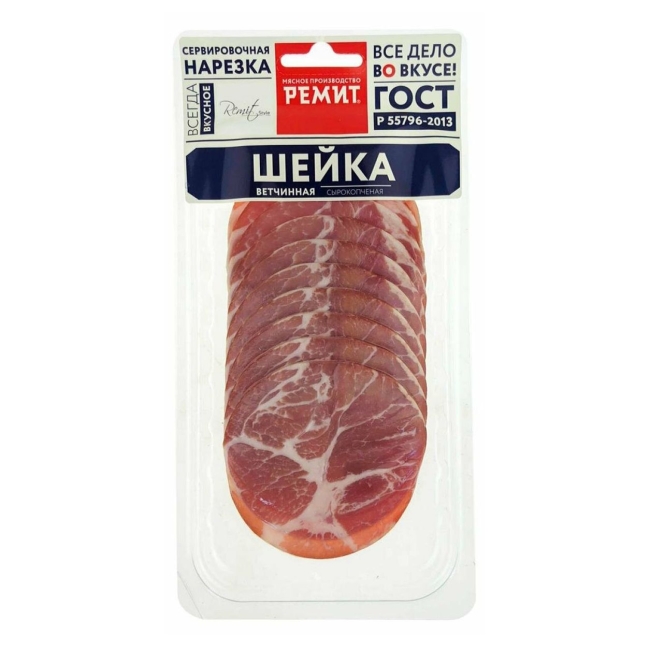 свинина, соль нитритная (соль, фиксатор окраски нитрит натрия), сахар. Производится на предприятии, где также используются горчица, молоко, орехи, пшеница, сельдерей, соя и яйца. Продукт готов к употреблению.