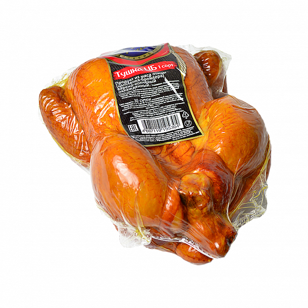 тушка цыплёнка-бройлера,вода,нитритно-посолочная смесь( соль,фиксатор окраски Е250) пряности(перец черный, чеснок), влагоудерживающий агент (Е450i,регулятор кислотности (Е451i),загустители (Е407,Е412, Е415), натуральный краситель (160b)