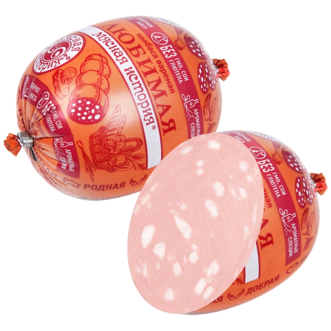 Любимая Мясная История – это вкусная вареная колбаса с отборным шпиком по оригинальной рецептуре. Для ценителей колбасы с жирком. Очень упругая, мясная, ароматная колбаса из свинины и куриного филе с легкими нотками свежего чеснока, перца и мускатного ореха. Как Любительская, только вкуснее!