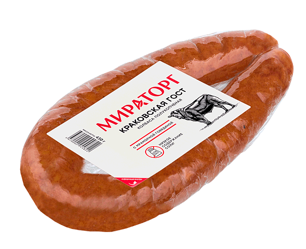 Полукопченая колбаса "Краковская" Мираторг приготовлена строго по ГОСТУ из отборного мяса собственного производства: свинины, мраморной говядины Black Angus и отборной свиной грудинки с добавлением пикантного мускатного ореха. Копчение на натуральной буковой щепе придает продукту неповторимый вкус и аромат.