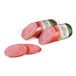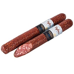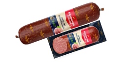 Свинина, шпик, соевый белок, посолочная смесь (соль, фиксатор окраски-нитрит натрия), пшеничные волокна, специи (перец черный, чеснок), сахар, усилитель вкуса и аромата (глутамат натрия), антиокислители (аскорбат натрия, изоаскорбат натрия), ароматизатор, краситель (кармин), мальтодекстрин, стартовые культуры. Продукт может содержать следы орехов, сельдерея, горчицы, глютена.