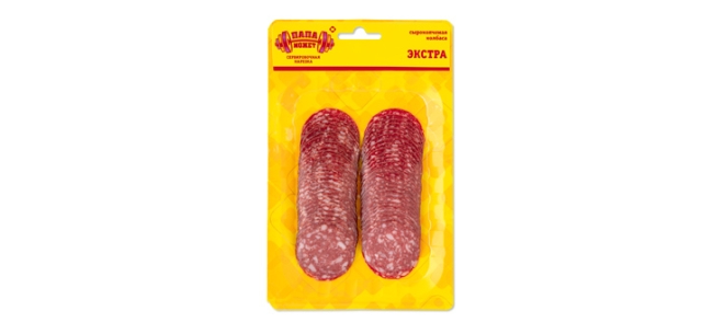 свинина, соевый белок, шпик, жир-сырец говяжий, комплексные пищевые добавки (молочный белок, смесь посолочно-нитритная (соль, фиксатор окраски Е250), декстроза, регулятор кислотности пирофосфаты, растительная клетчатка (пшеничная, цитрусовая), лактоза, пряности, усилители вкуса и аромата: Е621, Е635; мальтодекстрин, ароматизаторы, антиокислитель изоаскорбат натрия, красители: кармины, красный рисовый, Е150с); соль, стартовая культура
