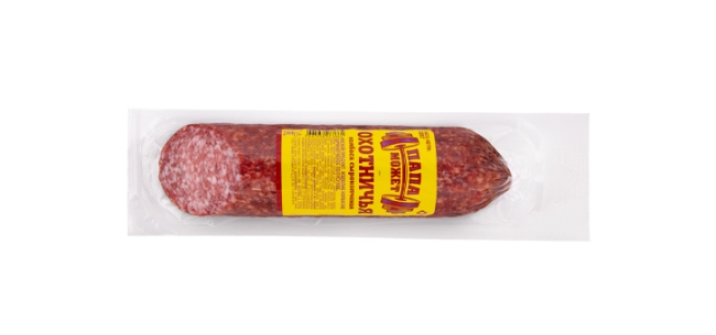 свинина, шпик, соевый белок, смесь посолочно-нитритная (соль, фиксатор окраски нитрит натрия), соль, молочный белок, регулятор кислотности пирофосфаты, растительная клетчатка (в т.ч. пшеничная), натуральные пряности (перец черный, чеснок, мускат, имбирь), сахар, усилитель вкуса и аромата глутамат натрия, ароматизатор, антиокислитель изоаскорбат натрия, красители: кармины, красный рисовый; стартовая культура