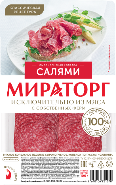 Сырокопченая колбаса «Салями», изготовленная из отборного мяса собственного производства, обладает насыщенным мясным вкусом в сочетании с ароматными пряностями: чесноком, паприкой, мускатным орехом и кориандром. Этот продукт прекрасно сочетается с хрустящим хлебом, свежими овощами и сырами.