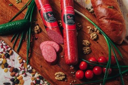 Колбаса с насыщенным цветом и благородным мясным вкусом идеально сочетается с красным вином.