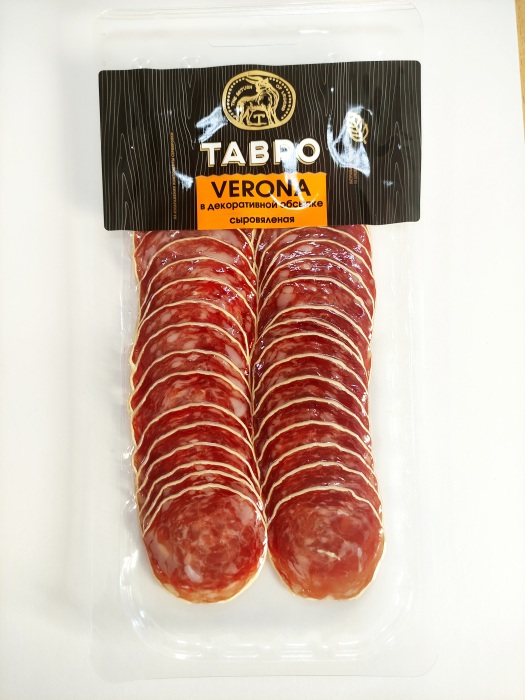 свинина, смесь посолочно-нитритная (соль пищевая, фиксатор окраски: нитрит натрия), комплексная пищевая добавка (сахар, пряности молотые, их экстракты: перец черный, перец чили, кориандр, тмин, паприка, анис, мускатный орех, перец красный, усилитель вкуса и аромата - глутамат натрия 1-замещенный, антиокислитель - изоаскорбат натрия), стартовые культуры микроорганизмов; состав поверхностного покрытия продукта (сыр сухой: молочная сыворотка, желатин, агент влагоудерживающий - Е422, молочный белок,
