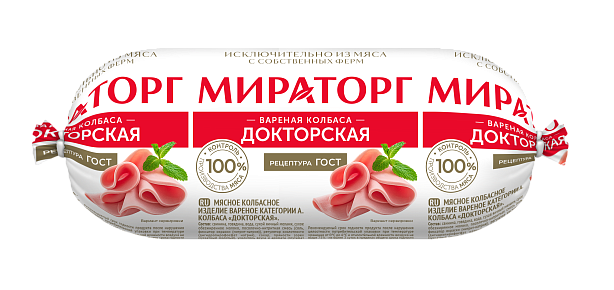 Колбаса "Докторская" приготовлена строго по ГОСТу из мяса собственного производства: свинины и мраморной говядины с добавлением молока, яиц и пряного мускатного ореха. Срез аппетитного нежно-розового цвета. Отличается классическим нежным вкусом, знакомым с детства.