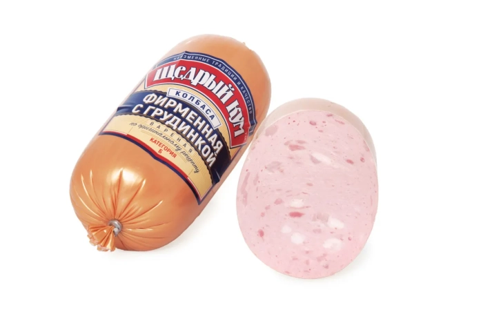 свинина, грудинка свиная, мясо куриное механической обвалки, вода, крупа манная, сыворотка молочная сухая, посолочная смесь (соль, фиксатор окраски Е250), экстракты пряностей, декстроза, усилитель вкуса и аромата Е621, стабилизаторы Е331, Е450, Е452, регуляторы кслотности Е262, Е330, Е451, антиокислитель Е300, краситель Е120. Оболочка искусственная