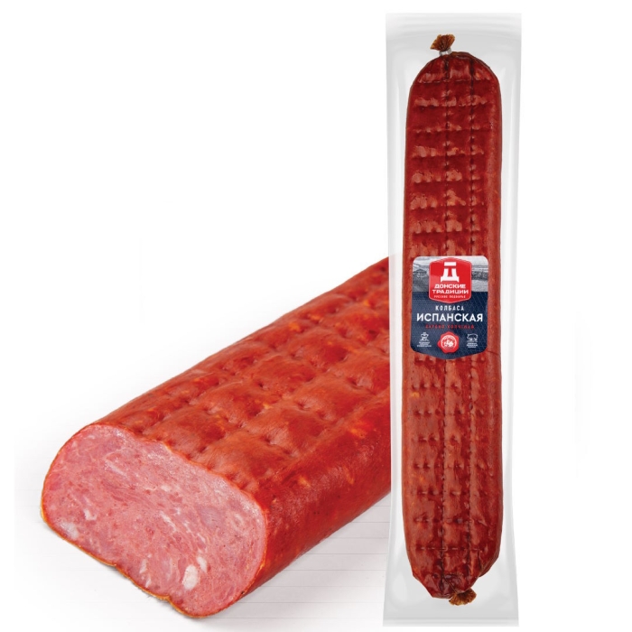 свинина, животный белок, вода питьевая, молочный белок, крахмал рисовый, смесь посолочно-нитритная (соль пищевая, фиксатор окраски-нитрит натрия), комплексная пищевая добавка (стабилизаторы (Е450(iii), Е452(ii), регуляторы кислотности (E451(i), ацетат натрия (i), цитрат натрия (iii)), антиокислители (аскорбат натрия, аскорбиновая кислота), загустители (Е407, Е425 (i)), чеснок, сахар, декстроза, усилитель вкуса и аромата (глутамат натрия), пряности, экстракты специй (паприка, гвоздика),