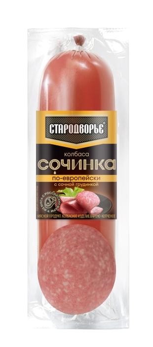 свинина, мясо цыпленка-бройлера бескостное, шпик, белковый стабилизатор (шкурка свиная, соединительная ткань говядины, вода питьевая), животный белок (свиной, говяжий), сыворотка молочная, смесь посолочно-нитритная (соль, фиксатор окраски: нитрит натрия), соль, стабилизаторы (пирофосфаты, полифосфаты, фосфаты кальция), регуляторы кислотности (трифосфаты, цитраты натрия, ацетат натрия), эмульгатор: моно- и диглицериды жирных кислот, каррагинан из водорослей eucheuma, усилитель вкуса и аромата