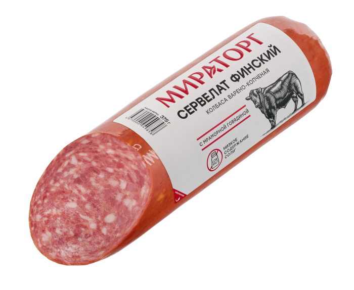 Сервелат «Финский» изготавливается из отборного мяса собственного производства: свинины и мраморной говядины Black Angus с добавлением натуральных специй и пряностей. Благодаря использованию натурального шпика, колбаса приобретает характерный мелкозернистый рисунок на срезе.