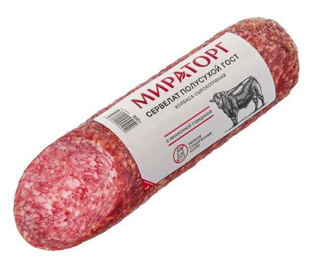 Сырокопченая колбаса "Сервелат" Мираторг приготовлена строго по ГОСТу из мяса собственного производства: отборной свинины, мраморной говядины Black Angus и натурального шпика с добавлением пряного мускатного ореха и душистого белого перца. Отличается зернистой структурой с мелкими кусочками шпика на срезе.