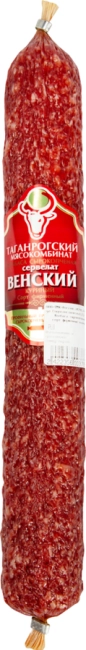 Сырокопченая колбаса Сервелат Венский – фирменный продукт с мелкими кусочками шпика и неповторимым изысканным вкусом.
