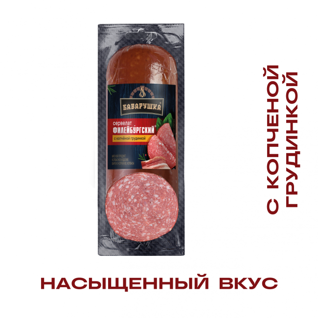 Сервелат с добавлением копченой грудинки и ароматных специй для насыщенного вкуса.