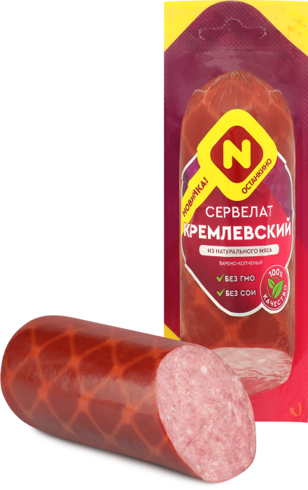 свинина, шпик, белковый стабилизатор (шкурка свиная, вода), вода, сыворотка молочная сухая, крахмал картофельный, посолочно-нитритная смесь (соль, фиксатор окраски Е250), соль, регуляторы кислотности: пирофосфат натрия, цитраты натрия; говяжий белок, сахара, специи (горчица, имбирь, черный перец, мускатный орех, чили, тмин), усилитель вкуса и аромата Е621, ароматизаторы, антиокислитель изоаскорбат натрия, краситель Е120