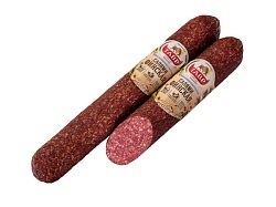 говядина, жир – сырец говяжий, посолочная смесь (соль поваренная пищевая, фиксатор окраски: нитрит натрия), чеснок, сахар, пряности: перец черный, перец душистый и тмин молотые, антиокислитель: аскорбиновая кислота
