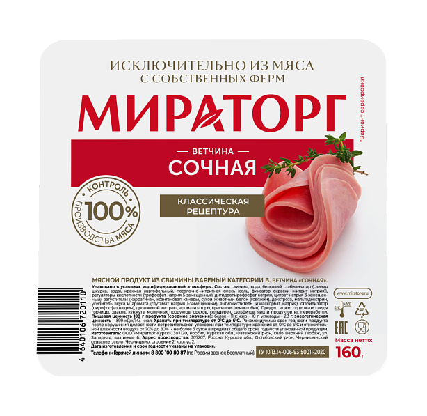 Ветчина «Сочная» обладает насыщенным мясным вкусом и ярким ароматом, с кусочками свиного окорока на срезе. Ветчина «Сочная» изготавливается из отборной свинины с добавлением ароматных специй, что придает продукту яркий вкус. Это идеальный вариант для быстрого перекуса или полноценного завтрака, который оценят взрослые и дети.