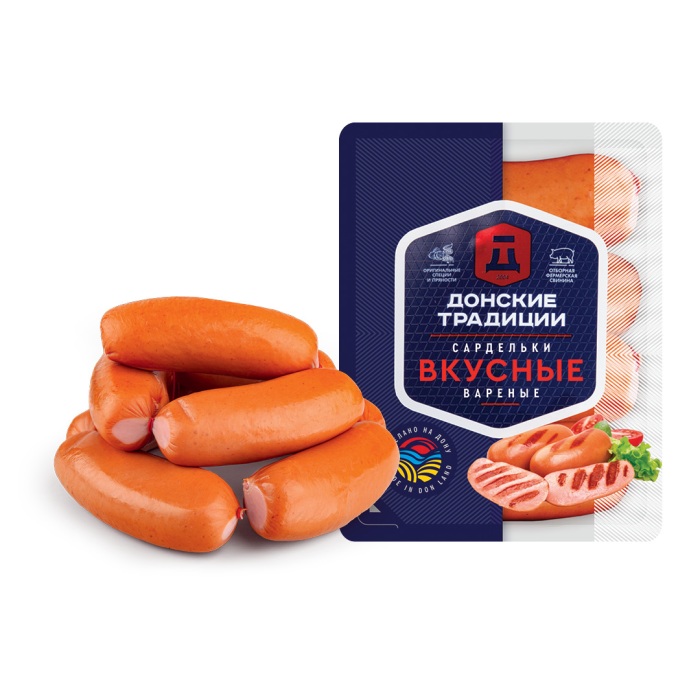 Сардельки «Вкусные» в натуральной оболочке, да еще подкопченные, любят все без исключения. Наши сардельки горячие, сочные, со вкусом муската, нежным оттенком сливок, не оставят вам шансов купить их еще и еще. Масса нетто: 550 гр