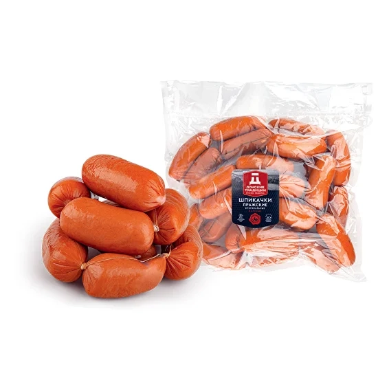 Шпикачки «Пражские», продукт класса эконом+. Обладает достаточной сочностью, что характерно для шпикачек, мясным приятным вкусом с нежной ноткой тмина, и конечно же умеренным копчением. Очень востребован нашими покупателями.