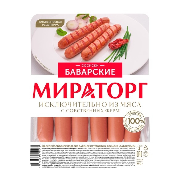 Аппетитные, сочные сосиски «Баварские» изготавливаются из мясо собственного производства: свинины, курицы и мраморной говядины Black Angus с добавлением ароматных специй. Рекомендуется подавать с картофельным пюре, салатом из свежих овощей или другим гарниром.
