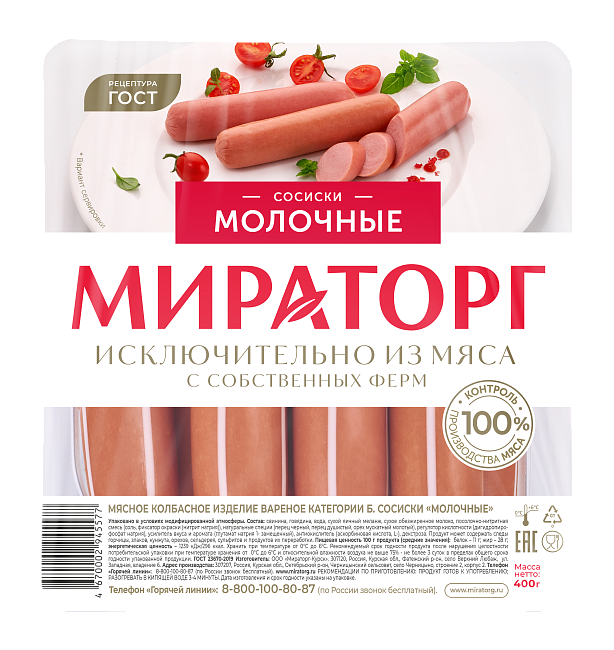 Нежны, сочные "Молочные" сосиски Мираторг изготовлены строго по ГОСТу из отборного мяса собственного производства: свинины, мраморной говядины Black Angus с добавлением молока, душистого перца и пряного мускатного ореха. Благодаря копчению на натуральной буковой щепе сосиски приобретают аппетитную корочку и аромат дымка.