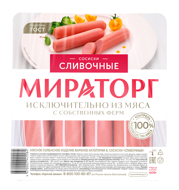 Сосиски «Сливочные» приготовлены строго по ГОСТу из мяса собственного производства: мраморной говядины Black Angus и свинины с добавлением сливок и ароматных пряностей. Имеют однородную структуру и нежный сливочный вкус, подчеркнутый тонким ароматом копчения. Отлично подходят для сытного перекуса, полноценного обеда или пикника на свежем воздухе.