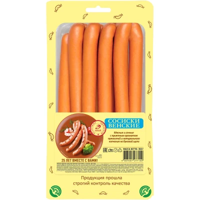 Сосиски Венские - это популярный продукт из отборной свинины, с добавлением говядины, куриного филе, соли и щепотки пряностей. Благодаря оболочке, проницаемой для натурального копчения, имеют румяный, золотистый цвет. Сосиски мясные, нежной консистенции, с насыщенным, мясным вкусом и ароматом.