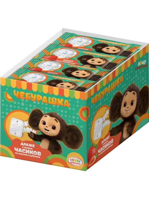 Ожерелье из драже на ниточке в виде "Часиков", упаковано во флоупак. Драже желтого, зеленого, белого цветов, вкус - клубники. Циферблат - драже в форме часиков.