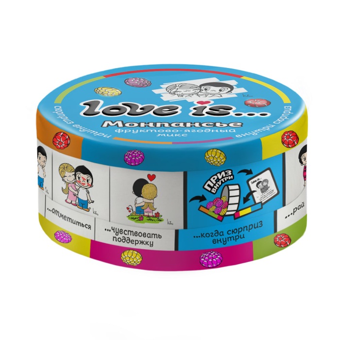 Бонбоньерка "Love is" — это милый и вкусный подарок гостям на свадьбе,либо приятный знак внимания к близким людям. Металическая круглая коробочка с милым принтом разделена на две части: в верхней части Вы найдете вкуснейшие фруктово-ягодные леденцы в форме мандариновых долек и разноцветных ягод, а в нижней галаграфический стикер с меняющейся картинкой и пожеланиями.В коллекции более 100 различных карточек.Коробочки подойдут для хранения мелких предметов: украшений,пуговиц ,рыболовных крючко
