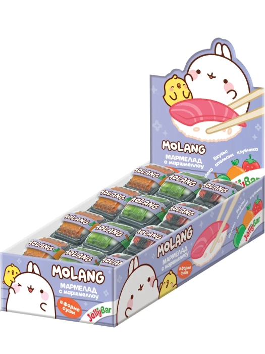 Мармелад с маршмеллоу в форме суши. На маршмеллоу белого цвета с ароматом клубники сверху кладется мармелад. Вкусы мармелада: клубника, апельсин, яблоко. Добрый и ласковый Моланг неповторим и легко узнаваем. Этот милый кролик любит веселиться и вкусно поесть. Его любимое лакомство - клубника. У Моланга много друзей, например, Пинко. Но самый близкий – это маленький цыплёнок Пиу Пиу. Моланг заботится о каждом и обо всём. Все любят Моланга, Моланг любит всех!