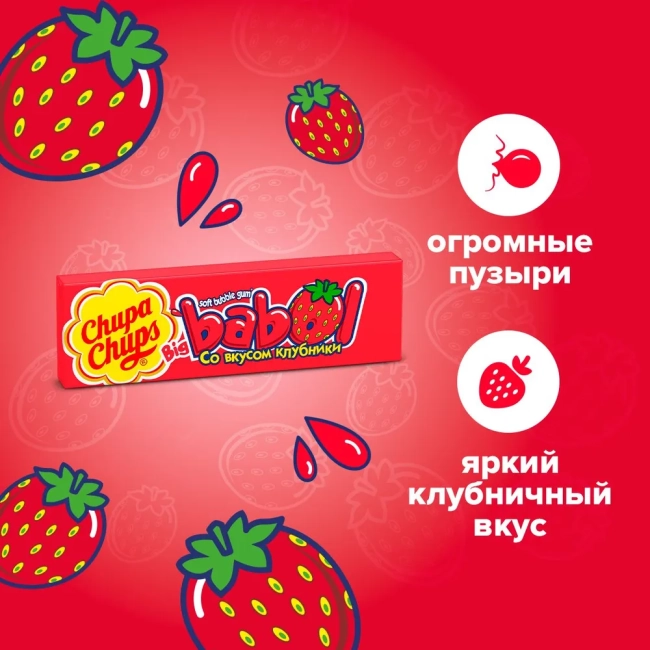 Сахар, основа жевательной резинки, патока, регулятор влажности - глицерин, лимонная кислота, идентичный натуральному ароматизатор, натуральный краситель - кармин, сок клубники сухой (эквивалент 1% клубничного сока), эмульгатор - соевый лецитин, антиоксидант (Е320).