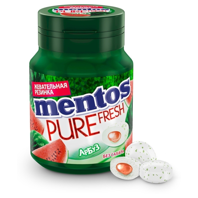 Жевательная резинка Mentos Pure Fresh вкус Арбуз – это cочные фруктовые драже жевательной резинки с жидким центром внутри в удобном формате банки. Вы почувствуете хрустящую внешнюю оболочку и вкус спелого арбуза.