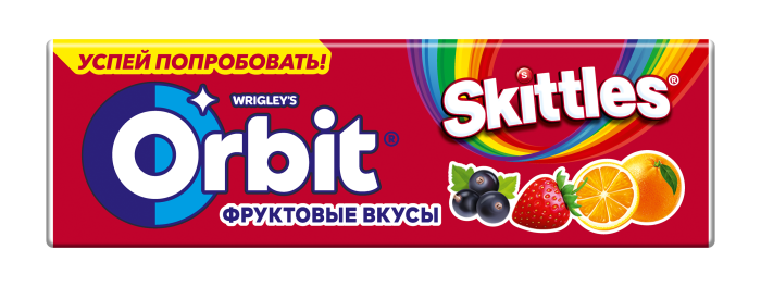 Orbit микс со вкусом Skittles — жевательная резинка без сахара с 3 яркими фруктовыми вкусами знаменитых драже Skittles: апельсин, клубника и черная смородина.