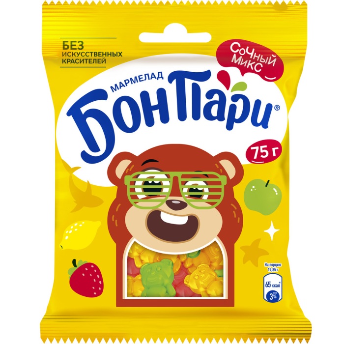 Патока, сахар, желатин, вода, регулятор кислотности (лимонная кислота), концентрированный яблочный сок, ароматизаторы натуральные, масло пальмовое, красители (антоцианы (получен из моркови), экстракт паприки, куркумин, медные комплексы хлорофиллинов (получен с использованием растительного сырья)), глазирователь (воск карнаубский).Продукт может содержать арахис, орехи, глютен, молоко и диоксид серы.