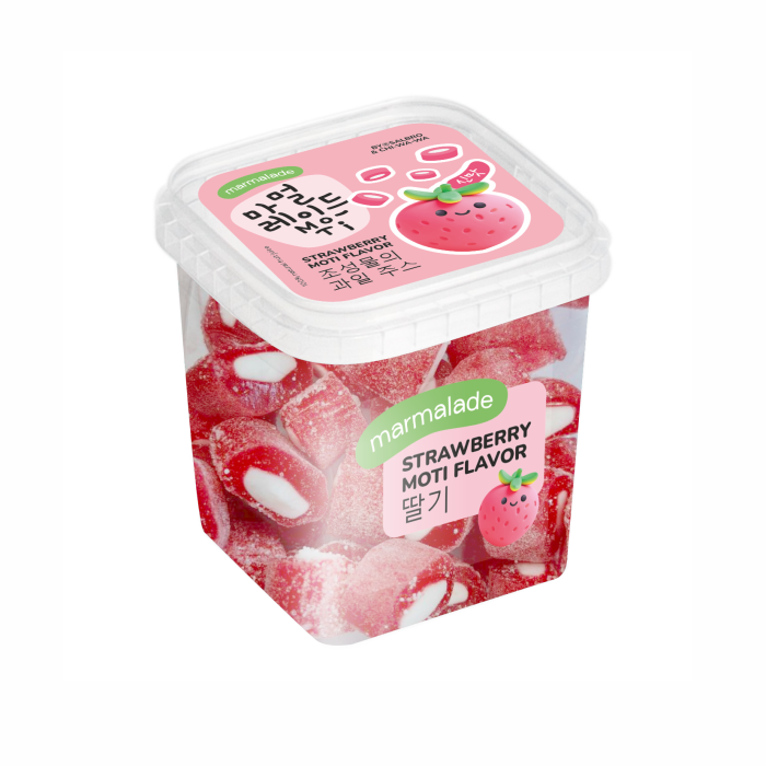 сахар, глюкозный сироп, пшеничная мука, крахмал кукурузный, масло пальмовое, декстроза, регулятор кислотности (лимонная кислота, яблочная кислота), влагоудерживающий агент (сорбитовый сироп), желатин говяжий, концентрированный яблочный сок, ароматизатор (клубника), эмульгатор (моно- и диглицериды жирных кислот), пищевой краситель (красный очаровательный АС). Предупреждение об аллергенах: содержит глютен.