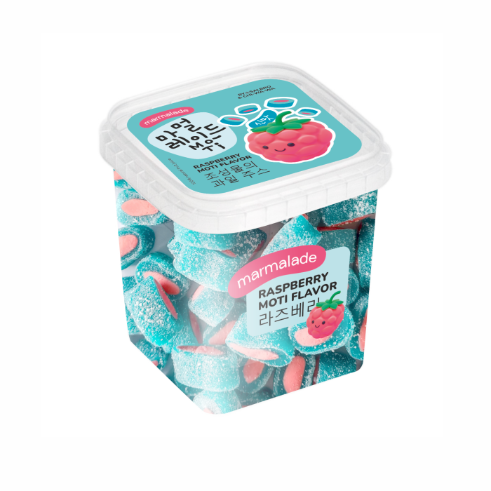 сахар, глюкозный сироп, пшеничная мука, крахмал кукурузный, масло пальмовое, декстроза, регулятор кислотности (лимонная кислота, яблочная кислота), влагоудерживающий агент (сорбитовый сироп), желатин говяжий, концентрированный яблочный сок, ароматизатор (малина), эмульгатор (моно- и диглицериды жирных кислот), пищевой краситель (синий блестящий FCF, красный очаровательный АС). Предупреждение об аллергенах: содержит глютен.