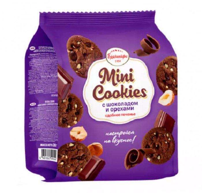 Сдобное печенье небольшого размера, приготовленное из шоколадного теста с добавлением фундука и кусочков шоколада. В яркой, красочной упаковке!