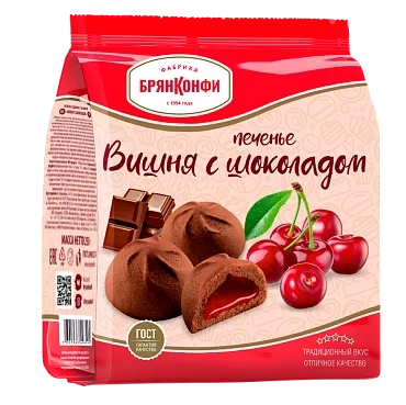 Сдобное печенье трюфельной формы из шоколадного теста с вишневой начинкой. В яркой современной упаковке!