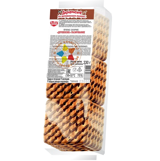 Рассыпчатое сахарное печенье изготовлено на деревенском молоке, декорировано темной глазурью.