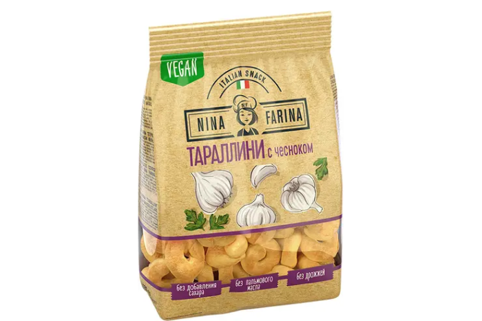 Простой состав: мука высшего сорта, подсоленная вода, высокоолеиновое подсолнечное масло и сушеный чеснок.